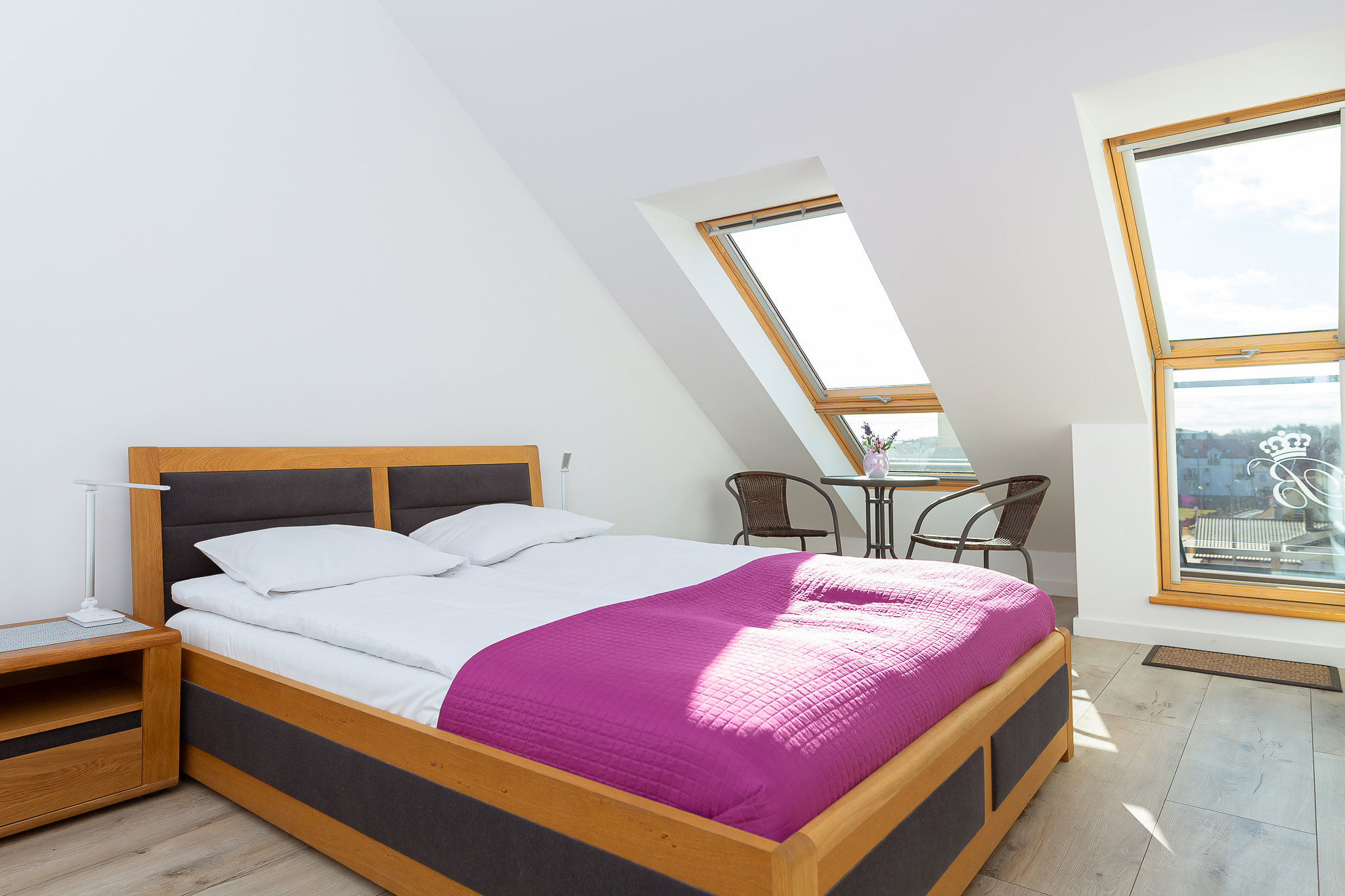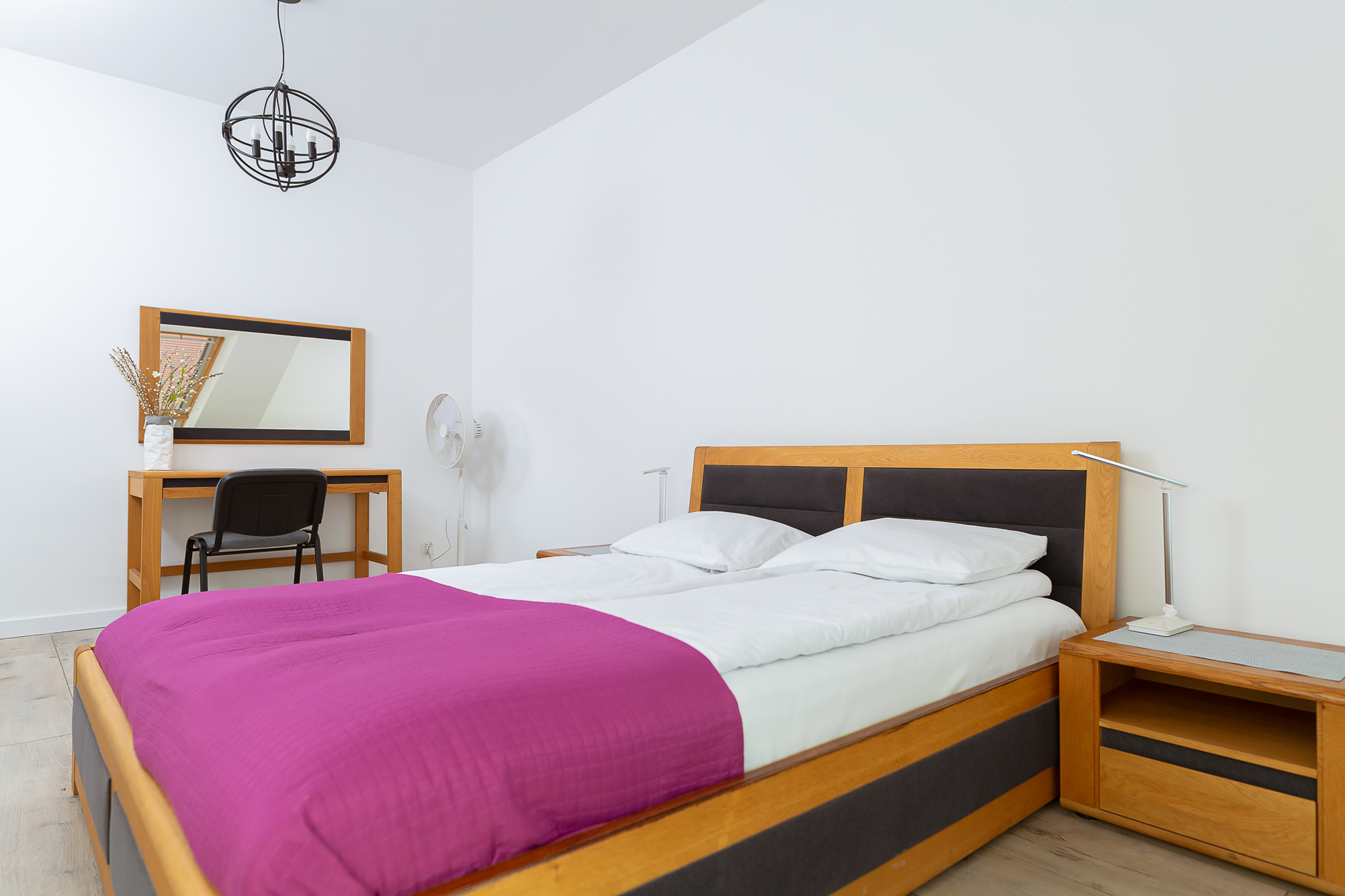 Do dyspozycji gości pozostaje przytulna sypialnia z dużym łóżkiem podwójnym oraz przestronny salon z aneksem kuchennym i rozkładaną sofą dla dwóch osób.